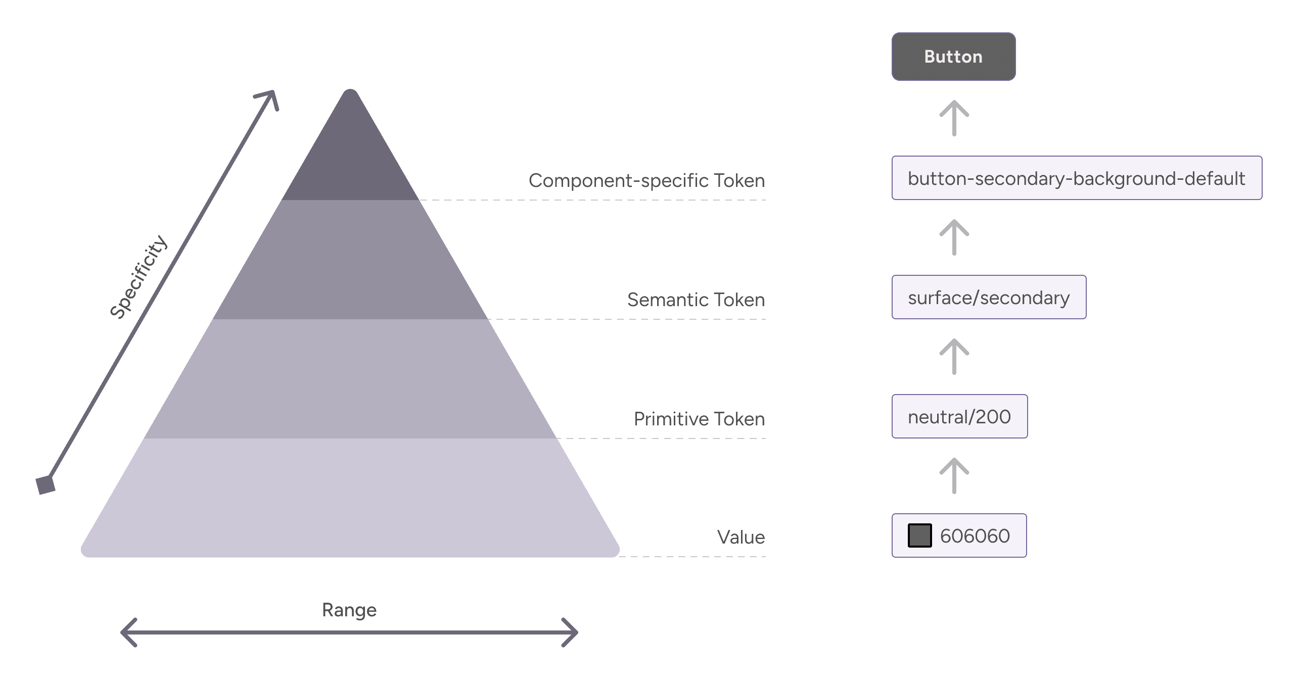 After having to change a single color on each form variation, I realized it was time to use design tokens: starting by a raw value (such as a HEX colour), this gets associated to a primitive token, which is the foundation for other tokens to build from. We also have semantic tokens, which give an indication of the general use of the token, and finally component-specific tokens.